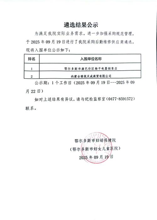 关于鄂尔多斯市妇幼保健院(鄂尔多斯市妇女儿童医院)采购后勤维修供应商遴选结果公告