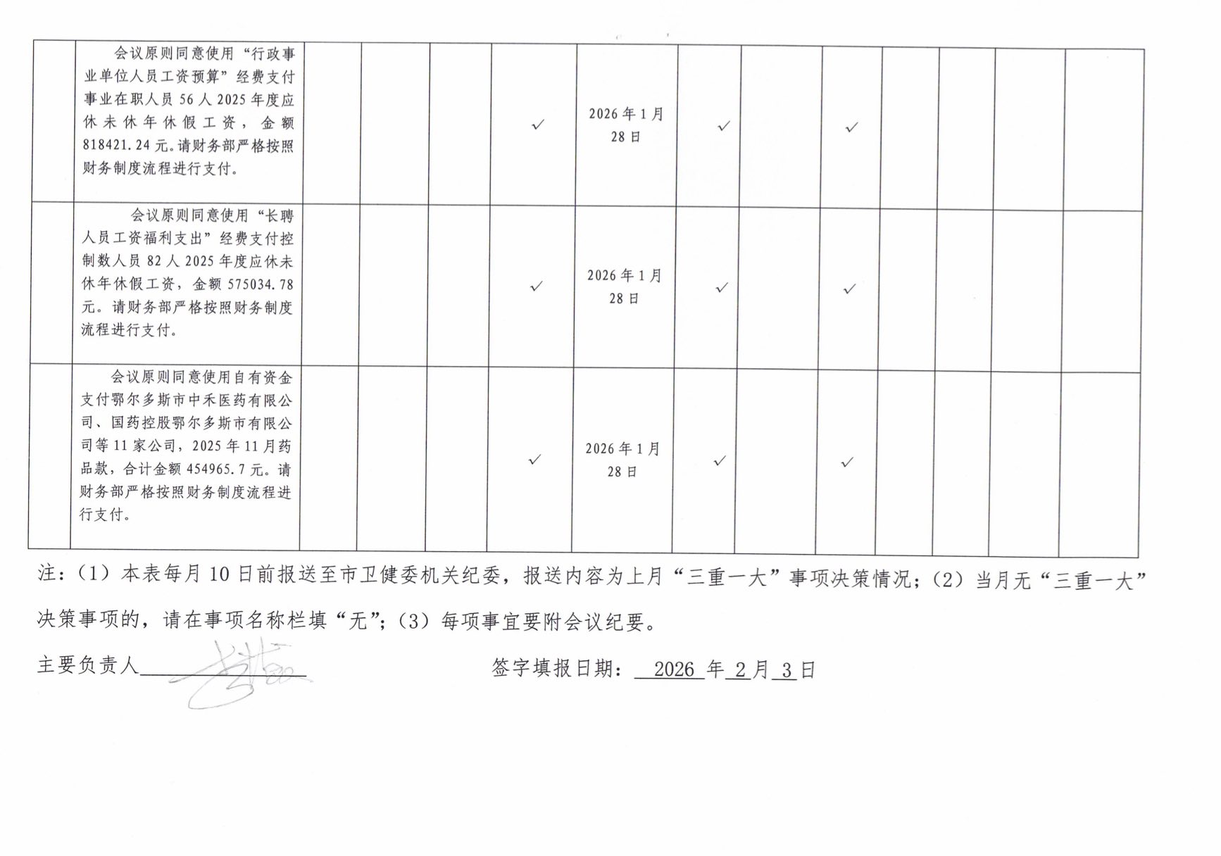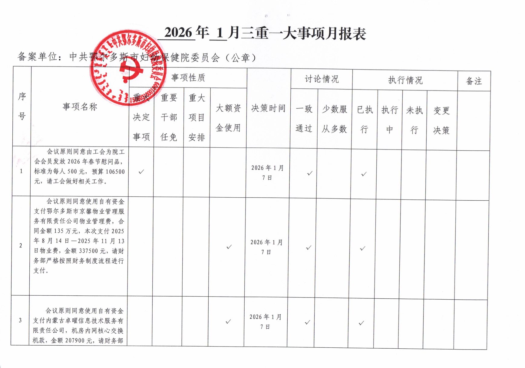 2026年1月份三重一大事项月报表