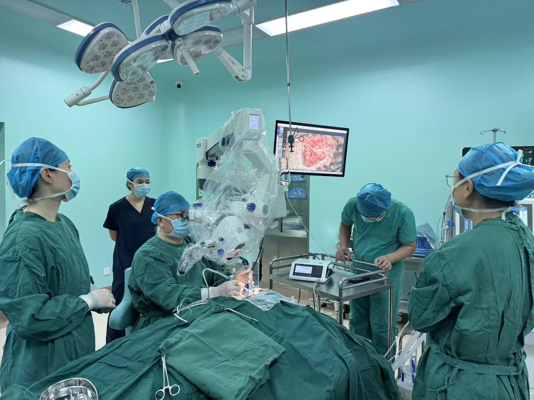 手术由上海儿童医学中心耳鼻咽喉科焦宇主任与本院手术团队协作完成。在精密的手术显微镜下,专家们将人工耳蜗的电极阵列精准植入患者的耳蜗内,将言语处理器置于耳后皮下。整个手术过程持续约1小时,术中监测显示电极反应良好,手术取得圆满成功。